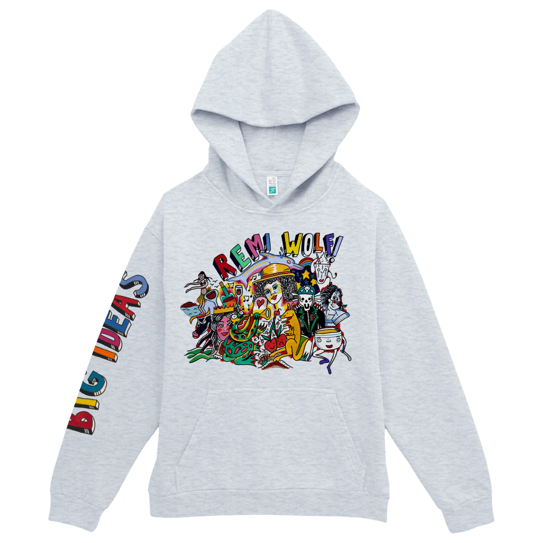 'Big Ideas Drawing’ design printed on a heather grey heavyweight hoodie.